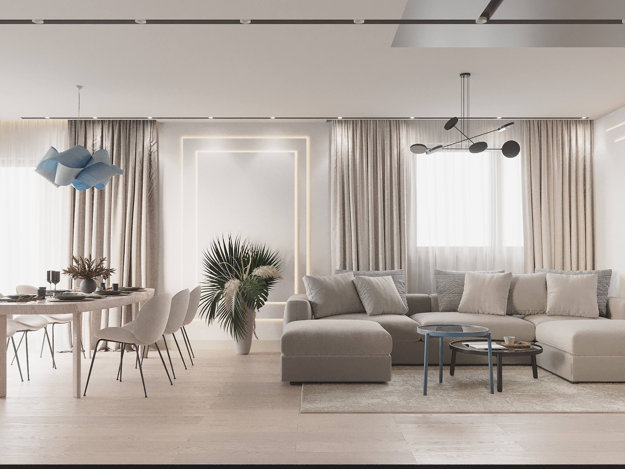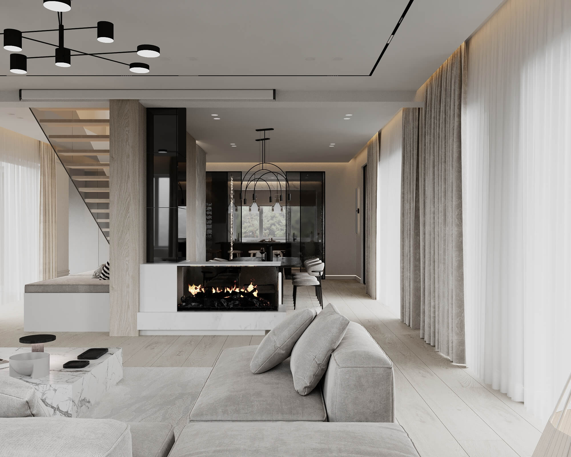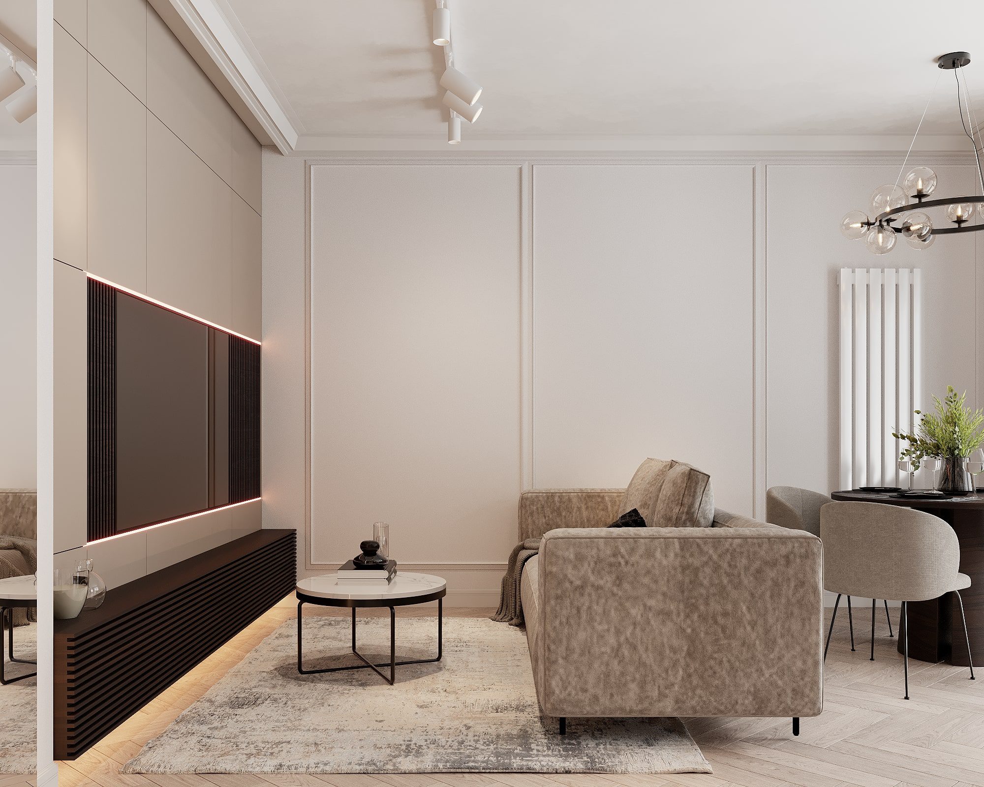 Niektóre projekty to w pełni minimalistyczne wnętrze – mało elementów na wierzchu, dużo ukrytego przechowywania i spokojna paleta barw. W tej części galerii wnętrz widać, jak wygląda przestrzeń, w której układ, proporcje i światło grają pierwsze skrzypce, a dodatki schodzą na drugi plan.